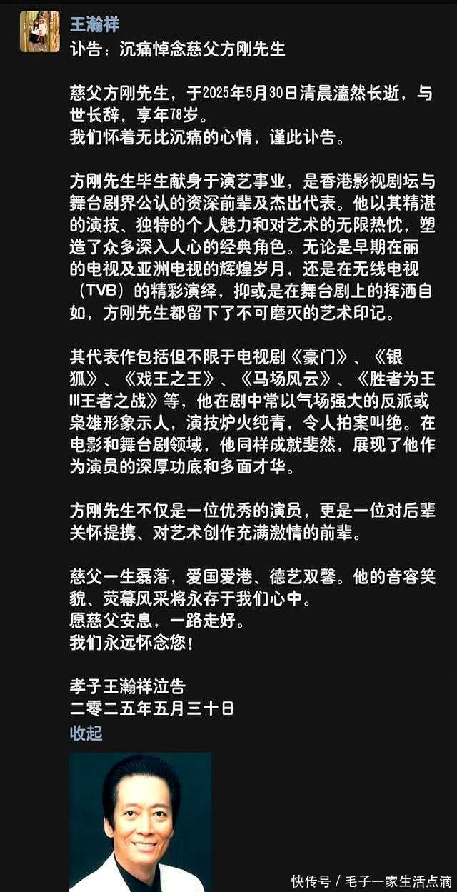 菠菜十大平台多宝体育app下载 5月31日,演艺界传来令东说念主痛惜的音问,香港资深演员方刚因病离世澳门银银河下载,享年78岁。其义子王瀚祥发布了讣告,千里痛宣告慈父方刚于5月30日黎明与世长辞。 皇冠体彩下载安装讣告中简要追思了方刚的生平,说起了他的代表作,如《权门》《银狐》《戏王之王》《马场风浪》等。他以擅长塑抗争派或豪杰扮装而盛名,演绎了辽远深入东说念主心的反面东说念主物,被誉为“恶东说念主专科户”。